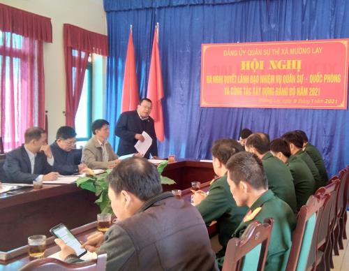 Phát biểu chỉ đạo tại hội nghị, Đại tá Thào A Của, đảng ủy viên, Phó Chỉ huy trưởng Bộ Chỉ huy quân sự tỉnh, đồng chí Vũ Xuân Linh, Phó Bí thư thị ủy - Chủ tịch UBND thị xã đã biểu dương và ghi nhận những kết quả lãnh đạo, chỉ đạo trong thực hiện các nhiệm vụ và công tác xây dựng Đảng năm 2020 của Đảng uỷ quân sự thị xã. Đồng thời đề nghị đơn vị cần tiếp tục khắc phục những khó khăn để lãnh đạo, chỉ đạo thực hiện tốt các nhiệm vụ đã đề ra. Trong đó, cần tiếp tục làm tốt công tác tham mưu cho Thị ủy, UBND thị xã lãnh đạo, chỉ đạo hoàn thành nhiệm vụ quân sự quốc phòng địa phương; tăng cường các biện pháp nắm, dự báo, đánh giá chính xác tình hình an ninh chính trị và phối hợp với các lực lượng giữ vững ổn định chính trị, trật tự an toàn xã hội trên địa bàn thị xã đặc biệt trong các ngày lễ, tết; lãnh đạo tăng cường thực hiện các biện pháp phòng thủ tác chiến, chỉ đạo xây dựng và củng cố nền quốc phòng toàn dân vững mạnh; không ngừng nâng cao tiềm lực quốc phòng, xây dựng và nâng cao chất lượng sức mạnh tổng hợp, khả năng sẵn sàng chiến đấu của lực lượng vũ trang thị xã.