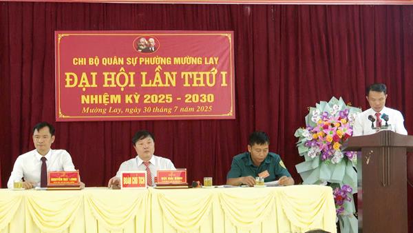 Phát biểu chỉ đạo tại Đại hội, đồng chí Chui Văn Thành, Phó Bí thư Thường trực Đảng ủy, Bí thư Đảng bộ các cơ quan Đảng phường Mường Lay đã chúc mừng kết quả Chi bộ Quân sự đạt được trong nhiệm kỳ qua. Ngoài các chỉ tiêu, giải pháp đã đề ra, đồng chí Phó Bí thư Thường trực Đảng ủy đề nghị nhiệm kỳ mới chi bộ Quân sự phường nghiên cứu thêm 3 giải pháp về công tác xây dựng chi bộ vững mạnh toàn diện; công tác phối hợp nắm tình hình, đảm bảo an ninh trật tự trên địa bàn cũng như an toàn về vũ khí, phương tiện phục vụ các cuộc luyện, diễn tập và nâng cao chất lượng tổng hợp, khả năng sẵn sàng chiến đấu của lực lượng vũ trang.