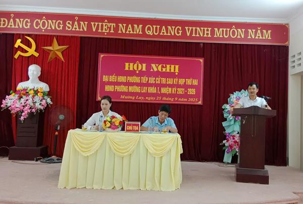 Tại buổi tiếp xúc, cử tri đã được nghe đại diện Tổ đại biểu số 1, HĐND phường Mường Lay thông báo kết quả kỳ họp thứ hai, HĐND phường khóa I, nhiệm kỳ 2021-2026. Nghe đại diện lãnh đạo UBND phường thông báo nội dung trả lời ý kiến, kiến nghị của cử tri gửi đến trước kỳ họp thứ hai, HĐND phường khóa I.