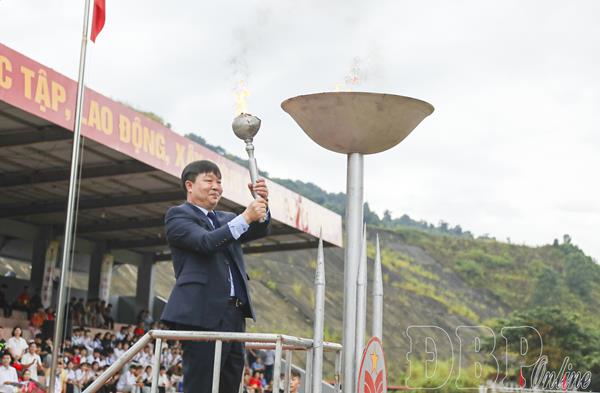 Bí thư Đảng ủy phường Mường Lay Bùi Hải Bình thắp ngọn lửa truyền thống khai mạc Đại hội.