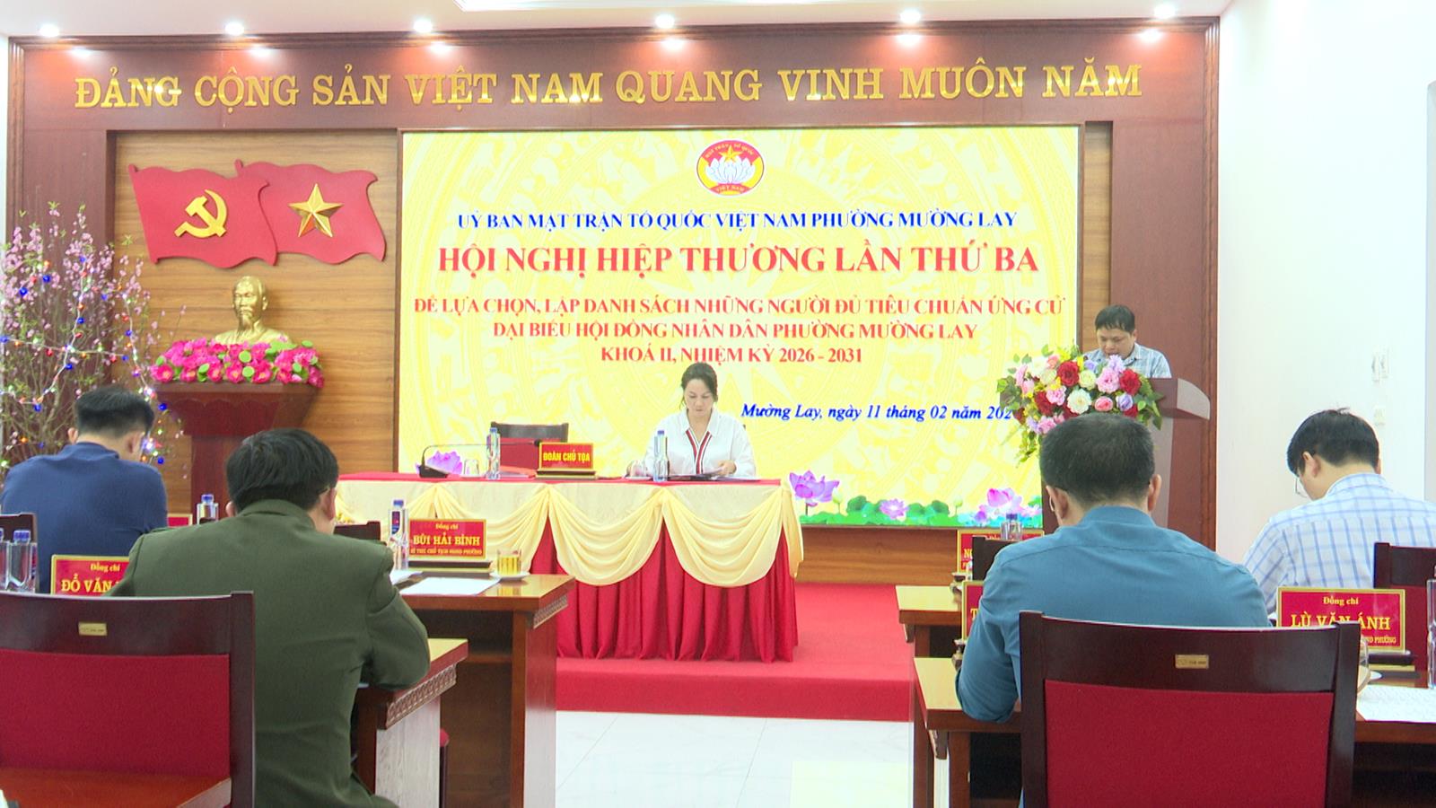 Chiều ngày 11-02, Ban Thường trực Ủy ban MTTQ Việt Nam phường Mường Lay tổ chức Hội nghị hiệp thương lần thứ ba để lựa chọn, lập danh sách những người đủ tiêu chuẩn ứng cử đại biểu Hội đồng nhân dân phường Mường Lay, khóa II, nhiệm kỳ 2026-2031.Dự hội nghị có đồng chí Bùi Hải Bình – Bí thư Đảng ủy, Chủ tịch HĐND phường; các đồng chí trong Thường trực Đảng ủy phường, đại diện Ủy ban bầu cử phường, Thường trực HĐND, lãnh đạo UBND phường, Ban Thường trực Ủy ban MTTQ Việt Nam phường, đại diện tổ chức thành viên Ủy ban MTTQ Việt Nam phường.