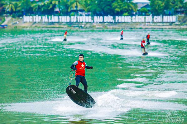 Lướt ván phản lực trên lòng hồ sông Đà tại phường Mường Lay.
